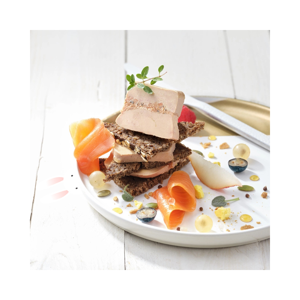 Foie gras de canard, truite fumée du Périgord 15.9% (poisson), sel, maniguette "graine de Paradis" 0.4%, gélatine, sucre, poivre, conservateur : nitrite de sodium, antioxydant : acide ascorbique. Origine : IGP Canard à foie gras du Périgord>