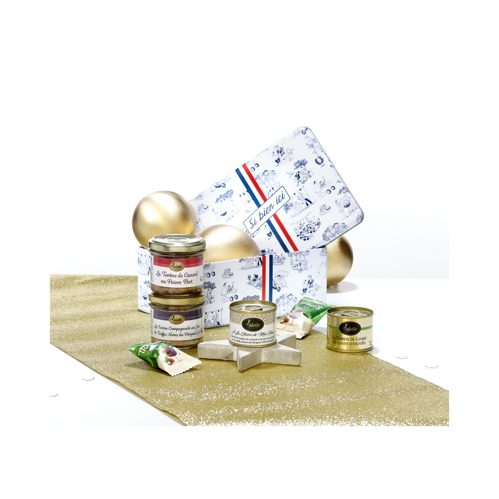 1 "A la gloire de mon père" Terrine de magret de canard et de foie de canard, jus de truffes noires du Périgord (20% foie gras) boite de 65 g