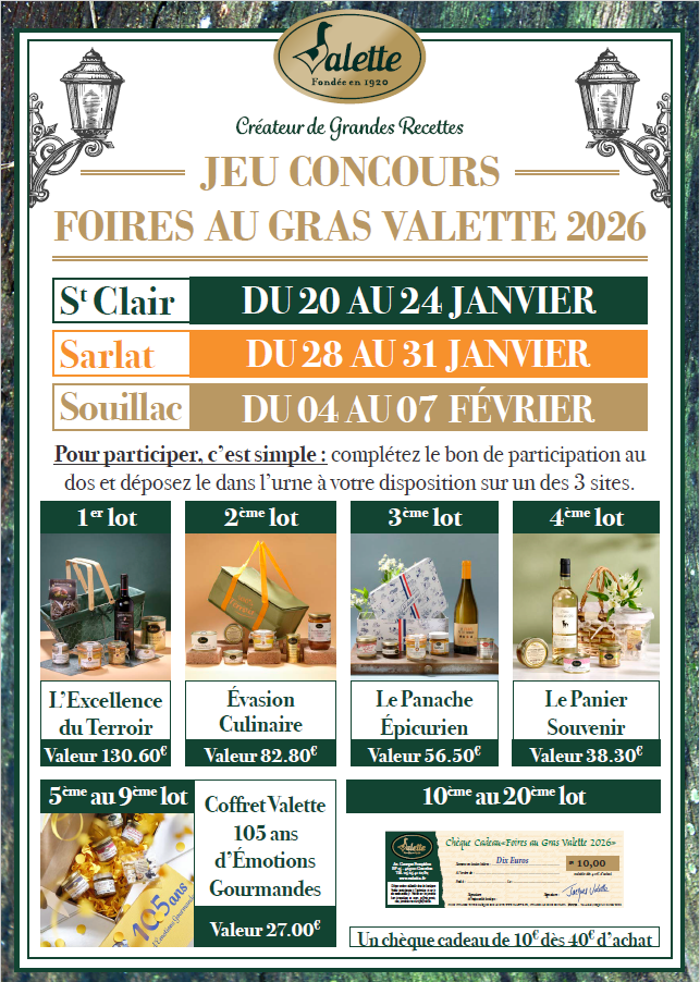 Vous pourrez également participer au Jeu concours de nos foires au gras et de profiter des cadeaux tels que :