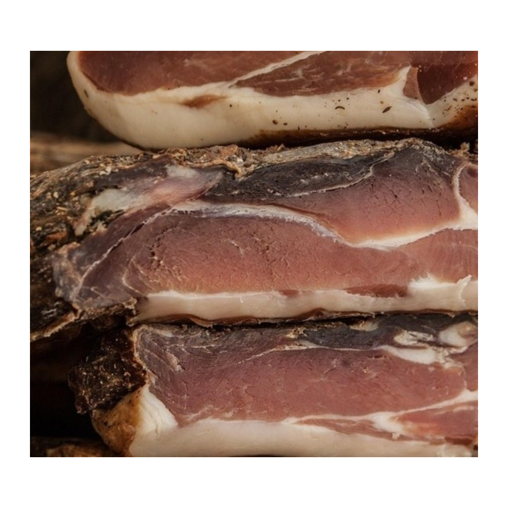 Savourez l’authenticité du Jambon Noir du Périgord affiné 7 à 8 mois, au sel doux, séché avec soin et délicatement frotté aux baies de genièvre pour une couleur rubis intense. 4 tranches identiques de 25g, 9cm x 20 cm.