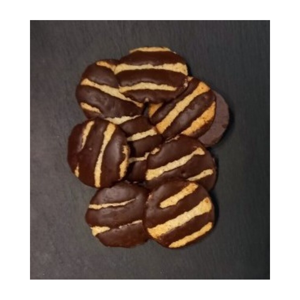 Farine de blé, Enrobage 30% :pâte à glacer(sucre, graisse végétale, cacao maigre, lécithine de soja), Sucre, Noix de coco 10%, Blancs d’œufs, Beurre, Poudre à lever, Sel, Arôme Naturel