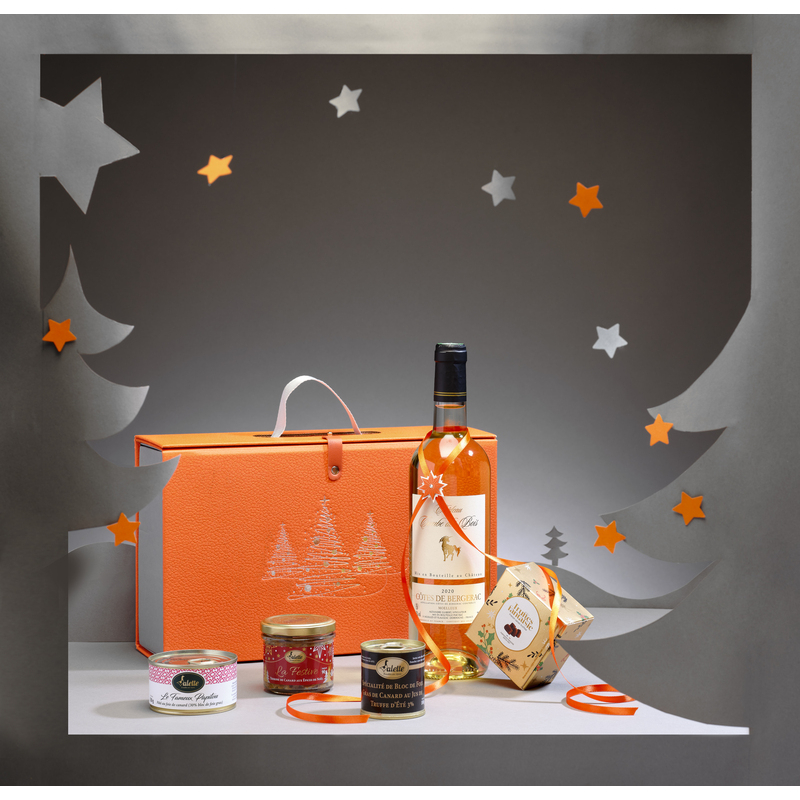 Le coffret carton rectangle orange et argent avec poignée ruban fermoir simili cuir (33,5x20x10,5 cm) contient :