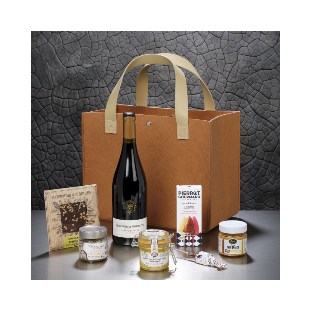 Le sac feutrine marron anses simili cuir créme dim 35*18*27 avec carton GM contient :