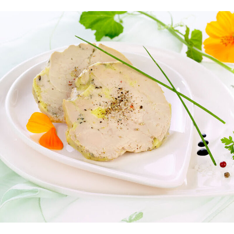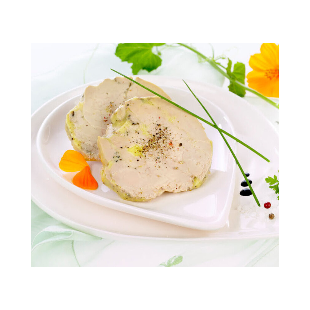 Foie gras de canard soigneusement éveiné, assaisonné simplement de sel, poivre, comme traditionnellement dans la région.