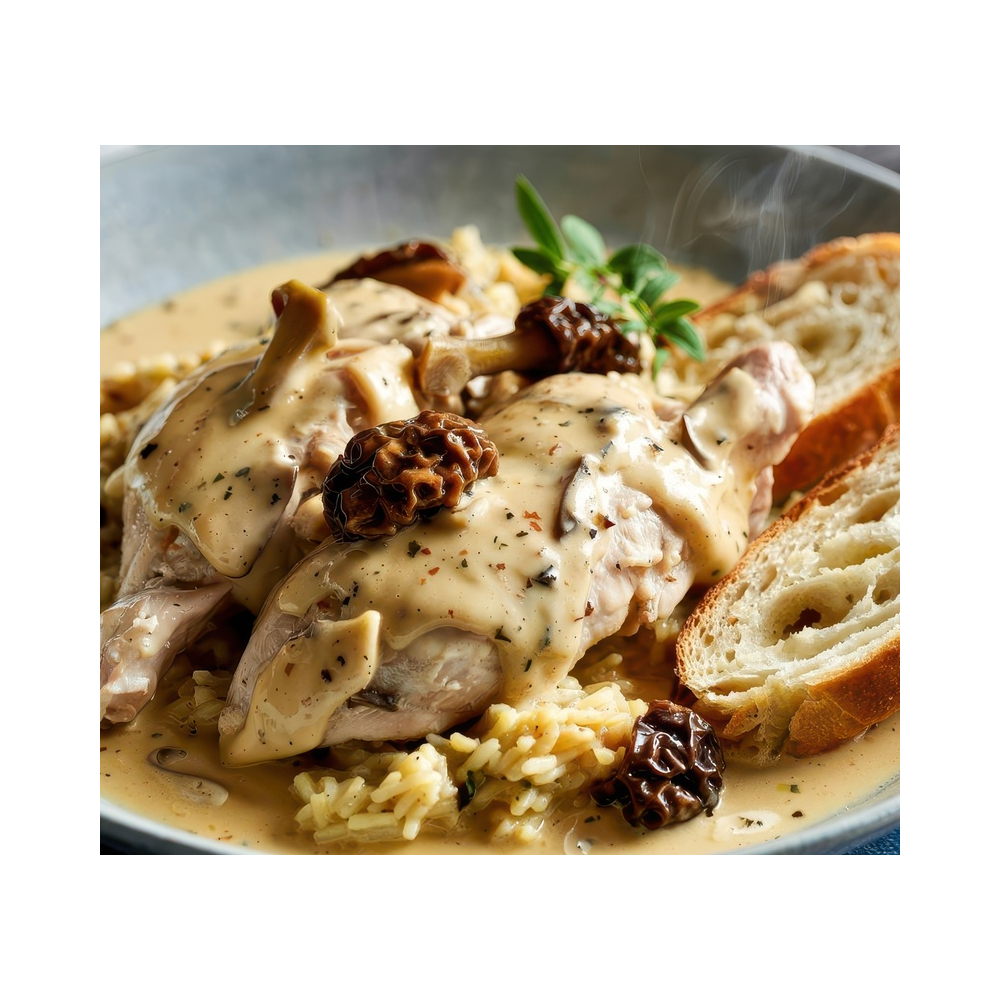 Les morceaux choisis de volaille aux morilles et au muscat de beaumes de venise