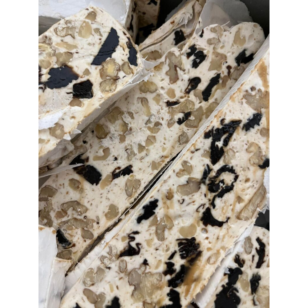 sucre, sirop de glucose, NOIX (20%), pruneaux séchés (20%) ((pruneaux d'Agen, conservateur : E200) (traces possibles d'ARACHIDE, de GLUTEN, MOUTARDE, SULFITES)), miel, pain azyme (fécule de pomme de terre, eau, huile d'olive), eau-de-vie de prunes 42% vol (0,6%), blanc d'OEUF